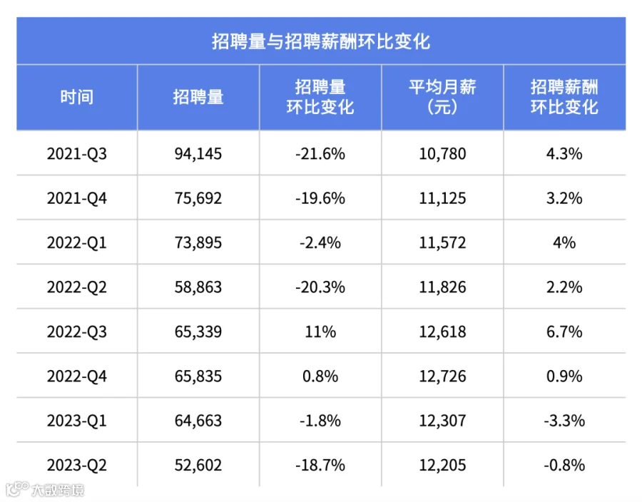 根据薪智对2万余家电子商务企业的调研数据显示,2023年电子商务行业招聘量与招聘薪酬呈现下滑趋势。2023年第二季度招聘量环比下降高达18.7%,招聘薪酬环比降低0.8%,行业招聘需求呈现整体下降趋势。