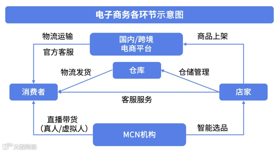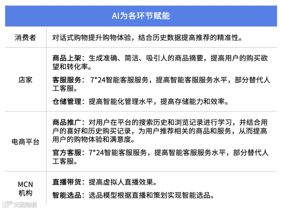 电子商务各环节的高效运作与AI技术的不断创新息息相关。在消费者领域,AI技术将提高推荐准确性;对店家而言,AI能够辅助商品上架、客户服务与仓储管理;电商平台则利用AI进行商品推广和客服服务;MCN机构则在直播带货和智能选品环节使用AI技术,提升直播效果。