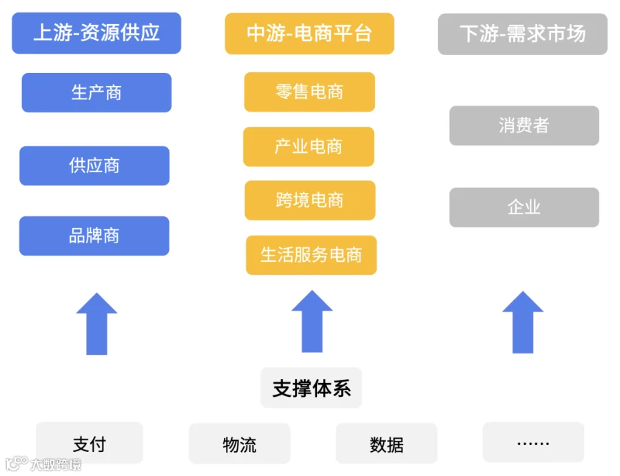 电子商务行业的产业链主要由资源供应(上游)、电商平台(中游)、需求市场(下游)、支撑体系组成。