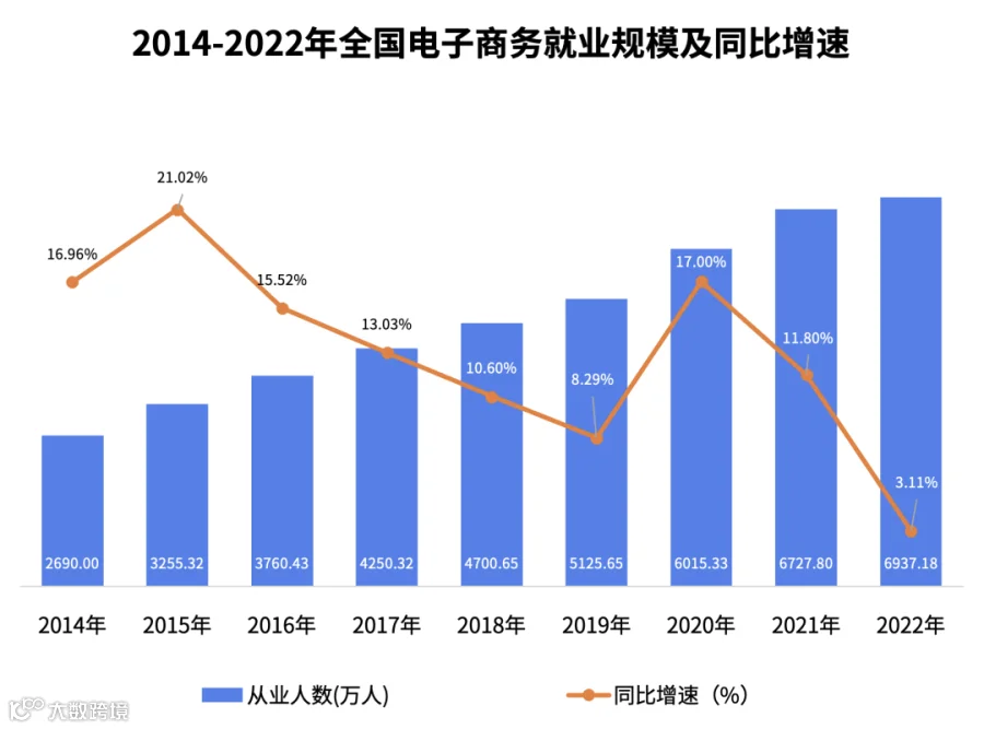 根据商务部《中国电子商务报告(2022)》披露的2014-2022年我国电子商务就业规模及同比增速来看,我国电子商务行业就业规模不断增加,总体就业规模在2022年达到最高,达到6937.18万人。但行业就业增速呈现一定下滑趋势,2022年就业规模增速更是下滑至3.11%。