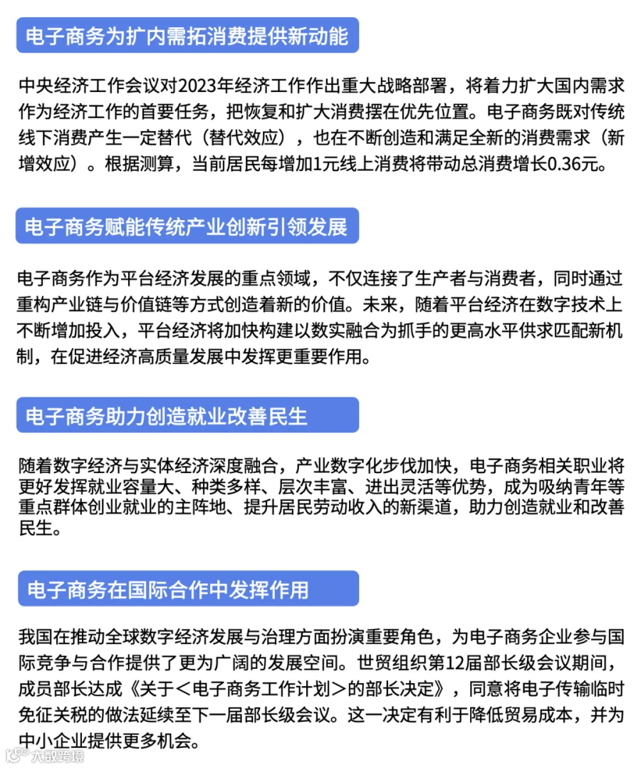电子商务将在扩内需、赋能传统产业、助力就业与国际合作中不断发挥重要作用。