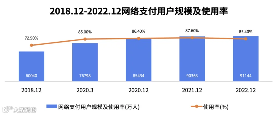 截至2022年12月,我国网民规模为10.67亿,较2021年12月新增网民3549万,互联网普及率达75.6%。网络支付用户规模上,截止2022年12月我国网络支付用户规模达9.14亿,使用率达85.40%。庞大的网民数量与网络支付用户规模构成了中国蓬勃发展的消费市场,也为电子商务发展未来的持续发展打下了坚实的用户基础,也是市场需求的主要来源。