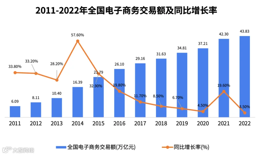 根据国家统计局数据显示,2022年全国电子商务交易额达到43.83万亿元。按可比口径计算,相较2021年增长3.5%。但行业整体增速从2014年开始至2020年逐步放缓,2021年,得益于电商市场加速向生产领域与服务交易拓展延伸,对单位电商交易额与服务类交易额快速增加,电子商务交易额增速也恢复至19.60%。但2022年受疫情、国内整体经济增速放缓等因素影响,电子商务交易额增速也回落至3.50%。电子商务领域经过20多年的高速发展,行业增速及增长空间也逐步缩减,企业更多回归到存量市场的争夺中。