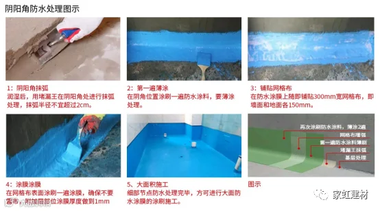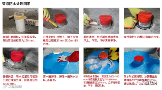 2、穿墙的管道和阴阳角等容易漏水的薄弱部位进行防水加强处理(图示)。