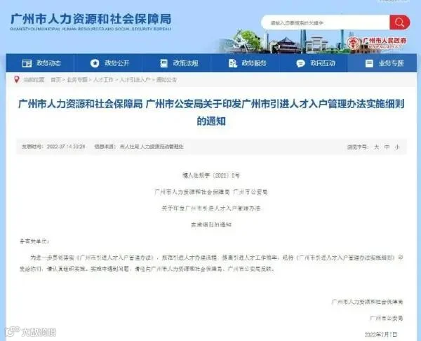 近日,广州市人力资源和社会保障局、广州市公安局印发《广州市引进人才入户管理办法实施细则》,取消了全日制本科生、中级职称人员等入户的社保参保年限限制,在广州市有参保记录即可落户。