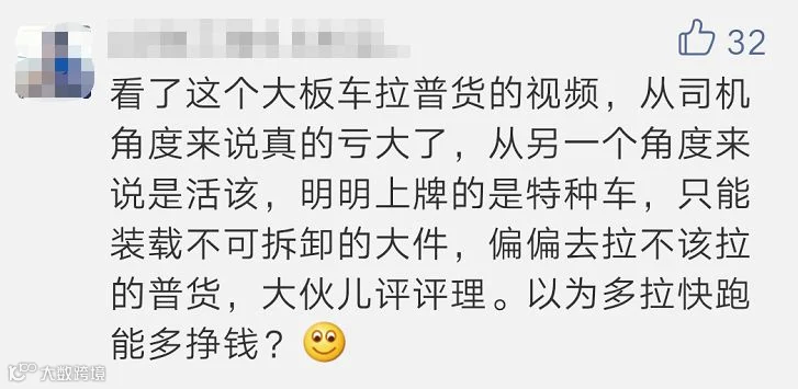 其实,大件车拉普通货物的情况并不少见,前两天,发布的一则“大件车拉货,货歪了”的视频,就有卡友表示,明明是大板车,不该拉普货。