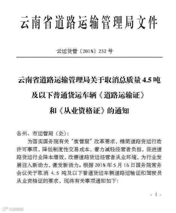 11月13日,云南省道路运输管理局发布了《关于取消总质量4.5吨及以下普通货运车辆道路运输证和从业资格证的通知》。