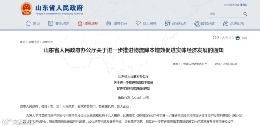 8月20日,山东省人民政府办公厅发布了《山东省人民政府办公厅关于进一步推进物流降本增效促进实体经济发展的通知》。
