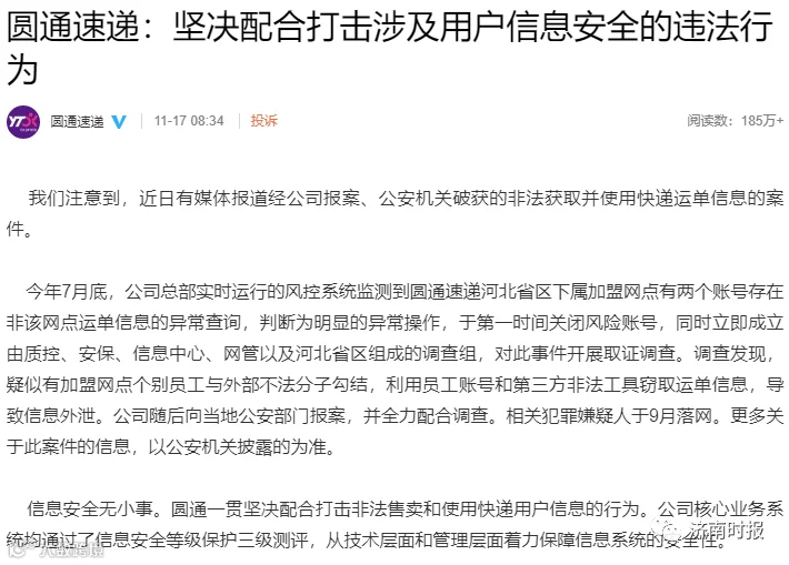 今年7月底,公司总部实时运行的风控系统监测到圆通速递河北省区下属加盟网点有两个账号存在非该网点运单信息的异常查询,判断为明显的异常操作,于第一时间关闭风险账号,同时立即成立由质控、安保、信息中心、网管以及河北省区组成的调查组,对此事件开展取证调查。调查发现,疑似有加盟网点个别员工与外部不法分子勾结,利用员工账号和第三方非法工具窃取运单信息,导致信息外泄。公司随后向当地公安部门报案,并全力配合调查。相关犯罪嫌疑人于9月落网。更多关于此案件的信息,以公安机关披露的为准。