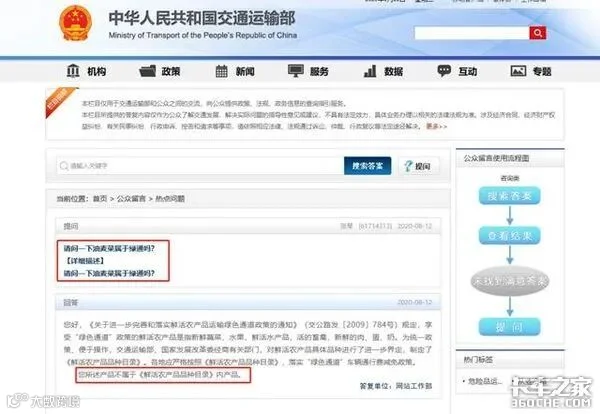 交通部的官网上询问“油麦菜是否是绿通”,然而得到的回答却是油麦菜不属于《鲜活农产品品种名录》内产品