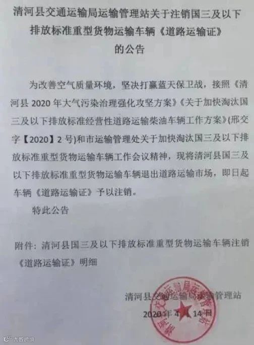 为改善空气质量环境,坚决打赢蓝天保卫战,按照《清河县2020年大气污染治理强化攻坚方案》《关于加快淘汰国三及以下排放标准经营性道路运输柴油车辆工作方案》(邢交字【2020】2号)和市运输管理处关于加快淘汰国三及以下排放标准重型货物运输车辆工作会议精神,现将清河县国三及以下排放标准重型货物运输车辆退出道路运输市场,即日起车辆《道路运输证》予以注销。