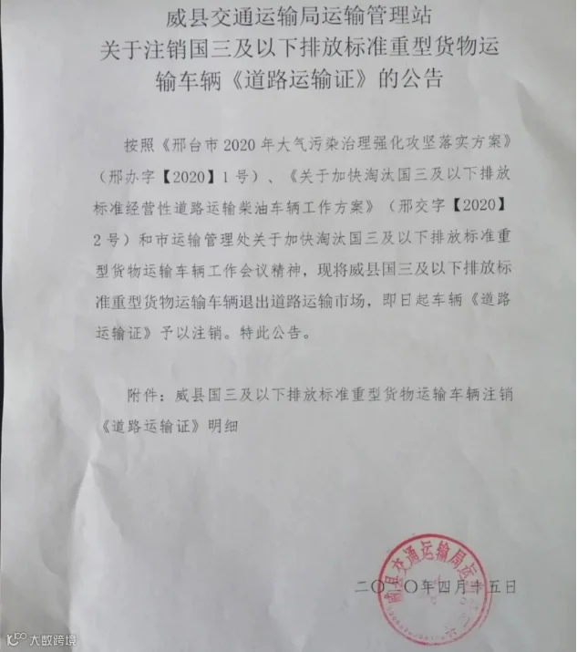 按照《邢台市2020年大气污染治理强化攻坚落实方案》(邢办字【2020】1号)、《关于加快淘汰国三及以下排放标准经营性道路运输柴油车辆工作方案》(邢交字【2020】2号)和市运输管理处关于加快淘汰国三及以下排放标准重型货物运输车辆工作会议精神,现将威县国三及以下排放标准重型货物运输车辆退出道路运输市场,即日起车辆《道路运输证》予以注销。