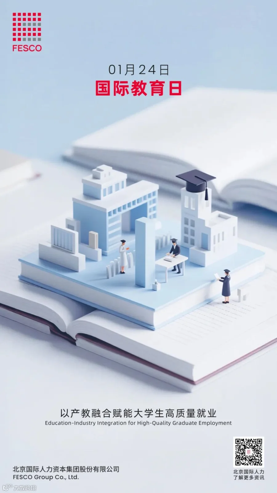1月24日是国际教育日,北京国际人力资本集团股份有限公司(简称“北京国际人力”,品牌“FESCO”,股票代码“600861”)所属北京外企国际教育咨询有限公司(简称“FESCO国际教育”)坚守“融汇全球智慧,点亮职场梦想”使命,以产教融合、人才就业、科技创新为核心深耕不辍。十余载积淀中,我们依托优质校企资源,以全链条专业服务赋能海内外学子求职路。2026年,我们将持续深化产教融合新征程,锚定“人才可持续发展”核心,深化多方协同,以教育与产业深度融合破解就业难题,筑牢高素质人才培育根基。