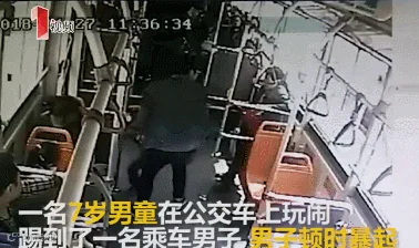 四川省遂宁市的一辆公交车上,七岁男孩无缘无故用脚踢了坐在对面的一个年轻男子三下。