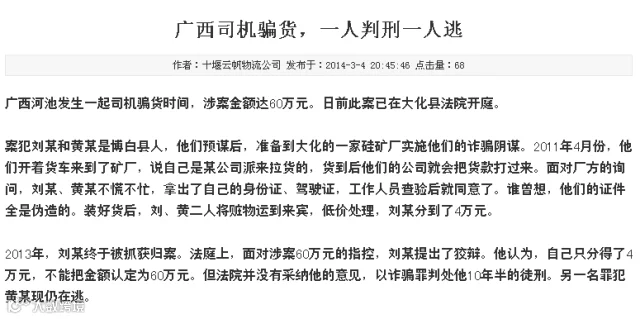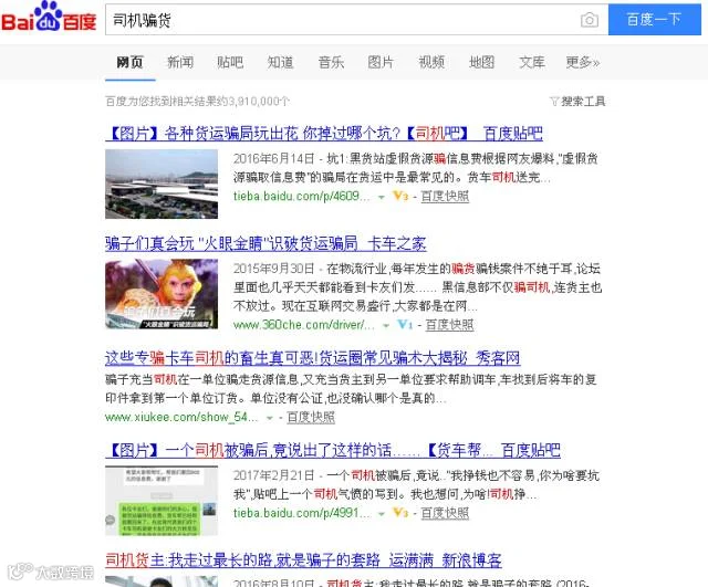 在百度输入“司机骗货”你会发现有270多万条搜索结果;输入骗货险可查出:骗货险全称“整车货物丢失(骗货)责任险”是保险公司针对国内市场多年存在的司机车主骗货、专门为保护货主货物安全、帮助配货站/物流企业降低经营风险和提高信誉而设计开发的产品。查近期的又看到“这位司机就这样拉走了我们的货?这样的讹诈大家小心了!”,查了些法院判决的案子都会发现,大部分将骗货的矛头指向了“司机”。