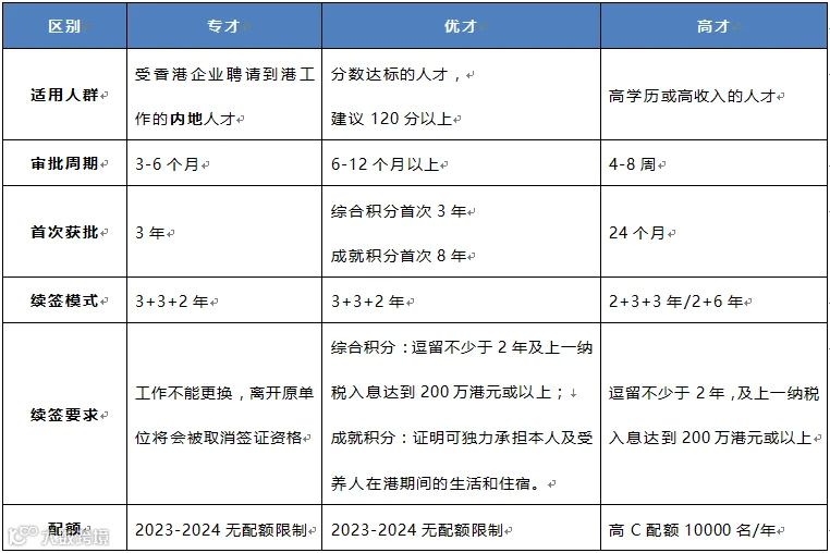 共同点:三种人才计划申请都可以获得香港居民身份,获批淮的申请人可带同配偶及18岁以下未婚及受养的子女来港,享受教育、医疗等香港居民福利。