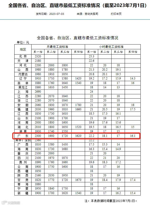 近日,人社部最新发布了全国各省、自治区、直辖市最低工资标准情况(截至2023年7月1日),上海以2690元仍居榜首。其中,广东省最低工资标准为2300元,深圳的最低工资标准是2360元。