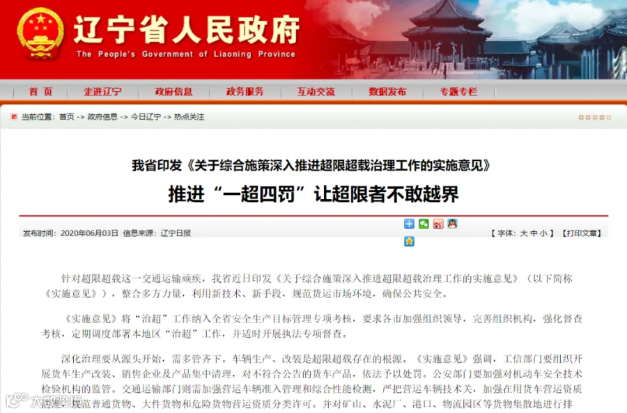 日前,辽宁发布《关于综合施策深入推进超限超载治理工作的实施意见》。其中明确,辽宁将严格按照国家和省有关规定,对超限超载违法行为进行处罚。