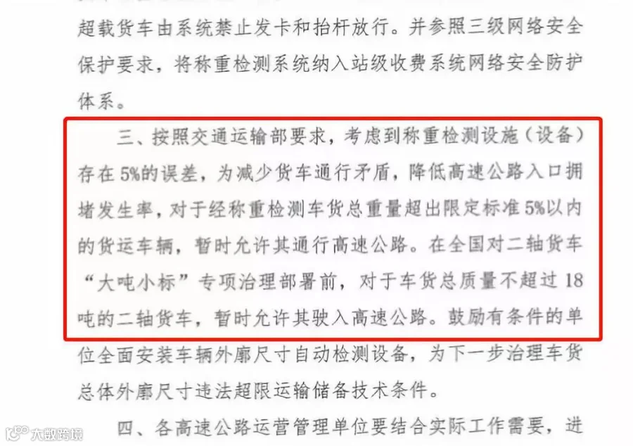 此外,根据《河南省关于全面启动高速公路收费站入口货车称重检测工作的通知》公开提出:在全国对二轴货车“大吨小标”专项治理部署前,对于车货总质量不超过18吨的二轴货车,暂时允许上高速。
