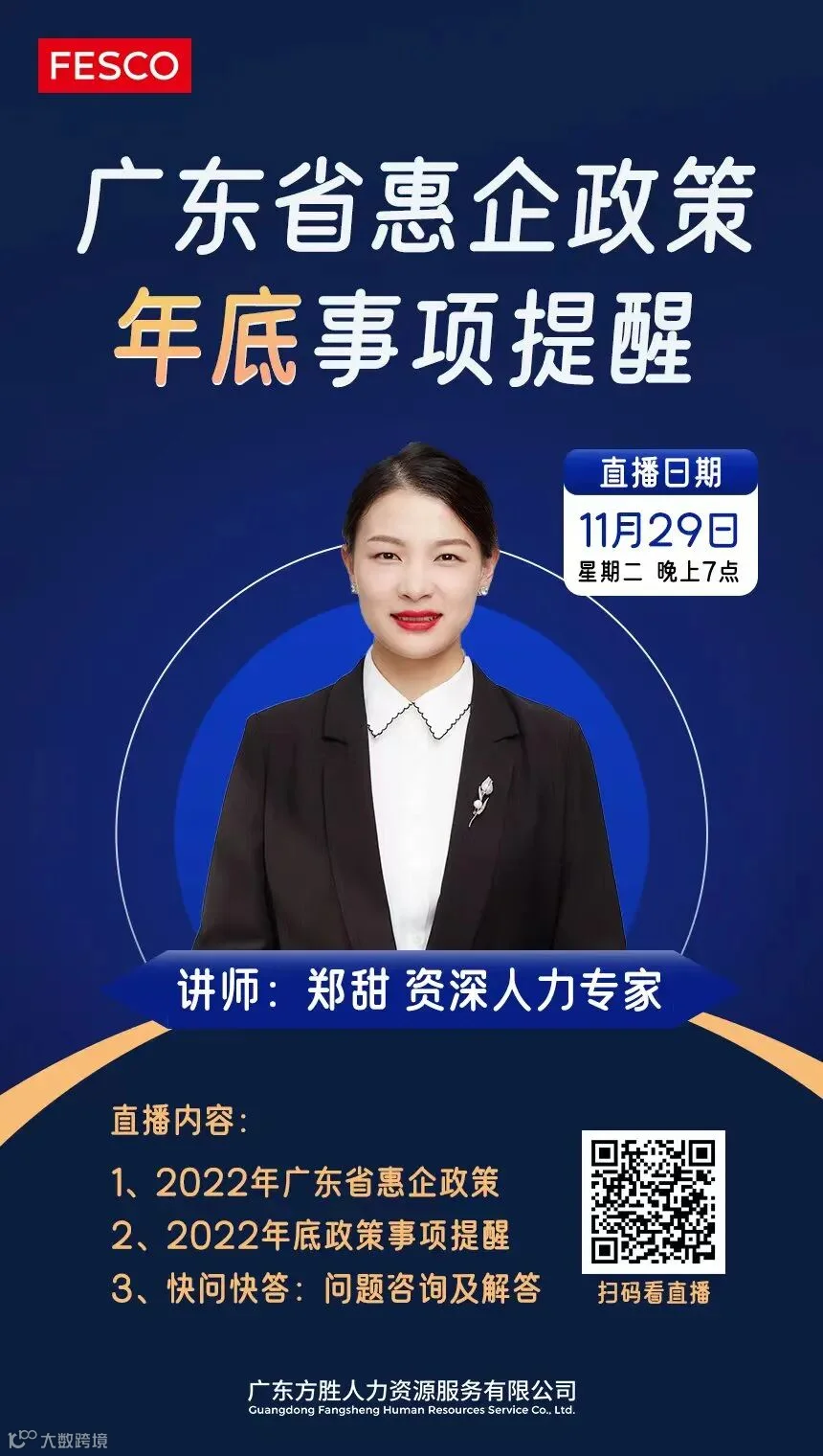 为方便各相关企业了解更多政策信息,同时为明年的惠企政策进行较好的筹备工作,FESCO广东方胜现邀请您观看11月29日的线上直播《广东省惠企政策年底事项提醒》,欢迎各企业观看、交流、分享。