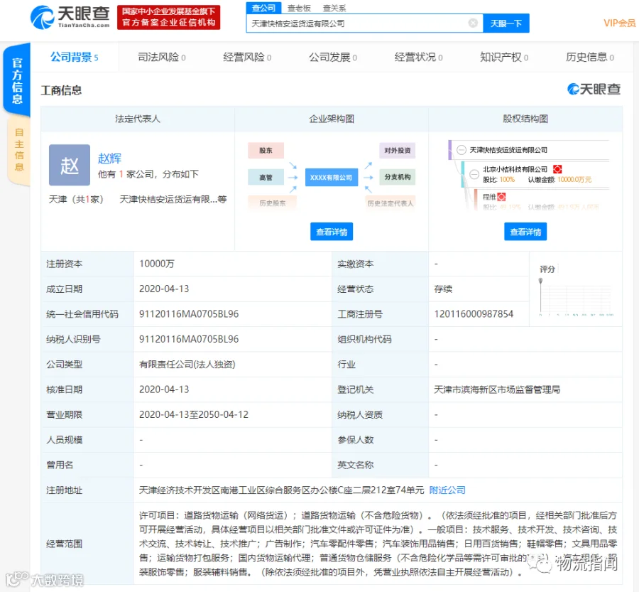 资料显示,该公司法定代表人为滴滴代驾事业部总经理赵辉,注册资本1亿元,经营范围包括道路货物运输(网络货运);汽车零配件零售;汽车装饰用品销售;运输货物打包服务;国内货物运输代理;普通货物仓储服务(不含危险化学品等需许可审批的项目);汽车租赁等。
