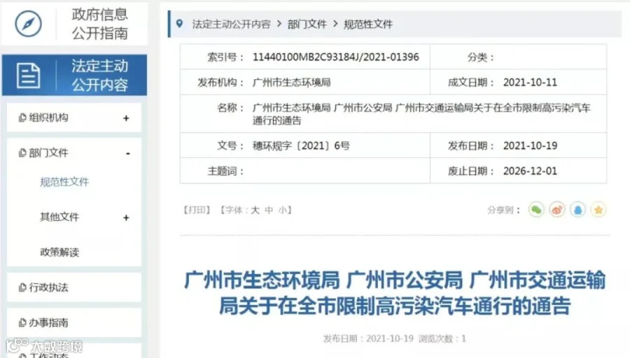 广州市生态环境局、广州市公安局、广州市交通运输局发布关于在全市限制高污染汽车通行的通告,表示:12月1日起,全天24小时限制高污染汽车在全市通行。