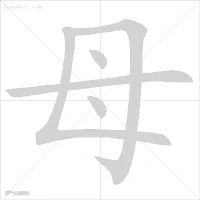 母笔顺:竖折、横折钩(两笔收尾处相交叉)、点、横、点(不要写完横再点两点)。凡从母者:拇、姆、毒、每、诲、悔、霉均如此。