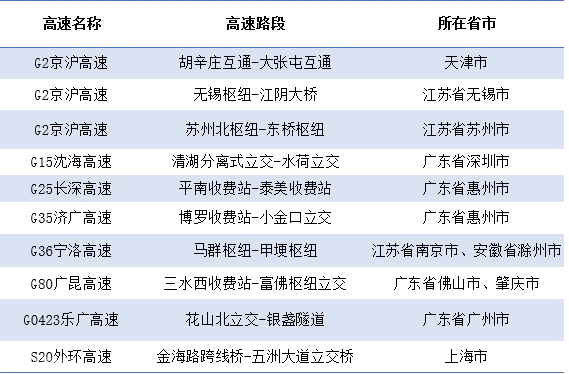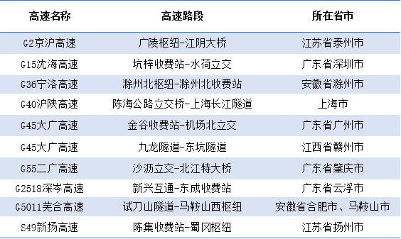 预计假期返程时段高速公路易发生拥堵缓行的路段主要有:G2京沪高速江苏泰州段,G15沈海高速广东深圳段,G36宁洛高速安徽滁州段,G40沪陕高速上海段,G45大广高速广东广州段、江西赣州段,G55二广高速江西赣州段,G2518深岑高速广东云浮段,G5011芜合高速安徽合肥、马鞍山段,S49新扬高速江苏扬州段等。