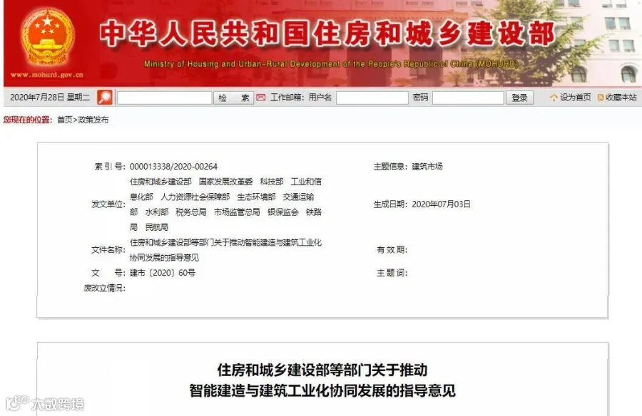 7月28日,住建部、发改委等13部门联合发布关于推动智能建造与建筑工业化协同发展的指导意见,提出发展目标与重点任务等。