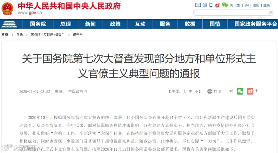 11月27日,国务院办公厅督查室通报了国务院第七次大督查发现部分地方和单位形式主义官僚主义典型问题。