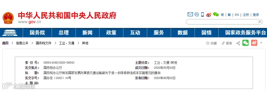 导读:国务院办公厅转发国家发展改革委交通运输部关于进一步降低物流成本实施意见的通知国办发〔2020〕10号各省、自