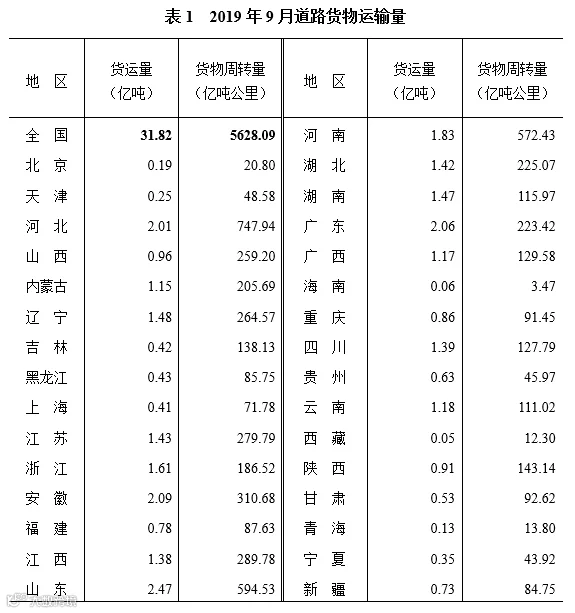 2019年9月,全国营业性货运车辆完成货运量31.82亿吨,货物周转量5628.09亿吨公里,平均运距为177公里。