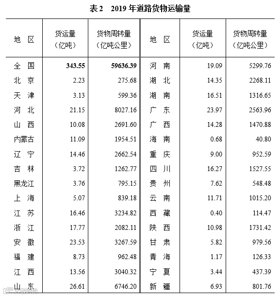 2019年,全国营业性货运车辆完成货运量343.55亿吨,货物周转量59636.39亿吨公里,平均运距为174公里。