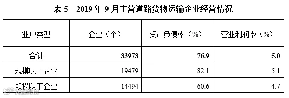2019年9月主营道路货物运输业务的企业平均资产负债率为76.9%,营业利润率为5.0%。个体经营户平均营业收入为2.44万元,燃油费、通行费、保险费、维修费等支出为1.55万元。此外,还需承担车辆折旧费用、人工成本等。