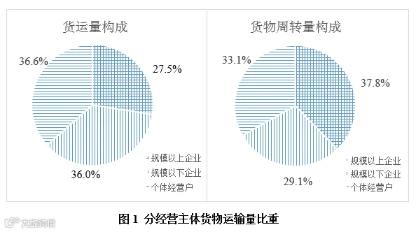 2019年9月规模以上企业、规模以下企业、个体户分别完成货运量8.75、11.44、11.63亿吨,占比为27.5%、36.0%、36.6%;货物周转量2125.26、1637.20、1865.62亿吨公里,占比为37.8%、29.1%、33.1%;平均运距分别为243、143、160公里。