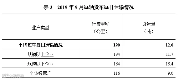 2019年9月每辆货车每日平均行驶190公里,运输货物12.0吨。每吨货物运输距离平均为177公里。