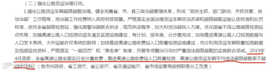 2019年4月底前,全省高速公路全面实行全计重收费,推进高速公路收费站入口称重检测,高速公路货运车辆平均违法超限超载率不超过0.5%