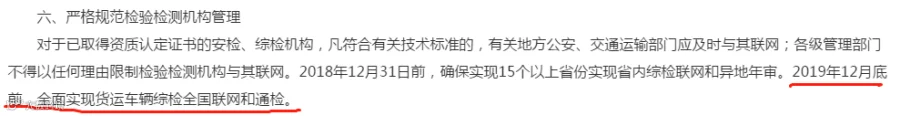 2018年12月31日前,确保实现15个以上省份实现省内综检联网和异地年审。2019年12月底前,全面实现货运车辆综检全国联网和通检,禁止指定或变相指定货运车辆检验检测机构。