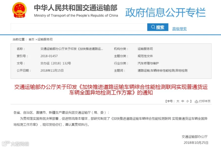 11月15日,交通运输部发布了《加快推进道路运输车辆综合性能检测联网,实现普通货运车辆全国异地检测工作方案》,重点要求各省建立综检联网系统,并在2019年底前实现普通货运车辆全国异地审验。