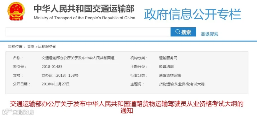 2018年11月26日,交通部发布了《中华人民共和国道路货物运输驾驶员从业资格考试大纲》,该大纲自2019年1月1日起施行。