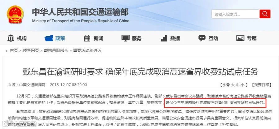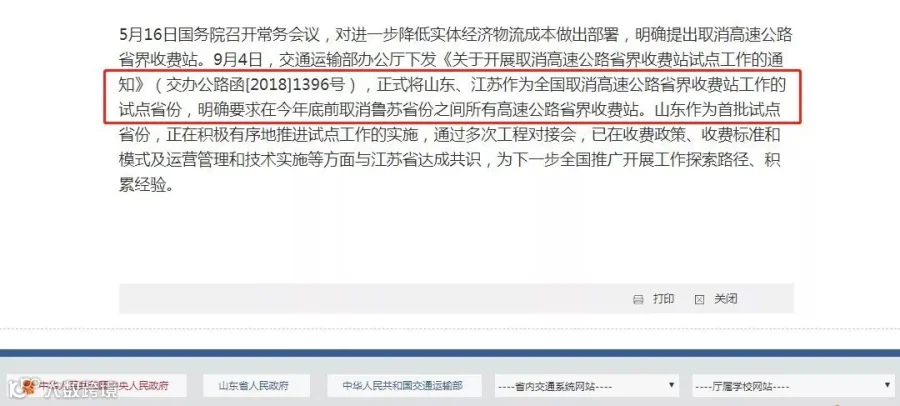 2018年9月4日,交通运输部办公厅下发《关于开展取消高速公路省界收费站试点工作的通知》,正式将山东、江苏作为全国取消高速公路省界收费站工作的试点省份,明确要求在2018年底前取消山东、江苏之间所有高速公路省界收费站。