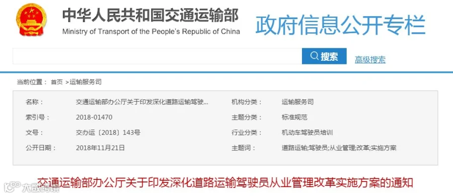 2018年11月21日, 交通运输部办公厅公开发布关于印发深化道路运输驾驶员从业管理改革实施方案的通知,重点推进2019年底取消司机两年一次的再教育。