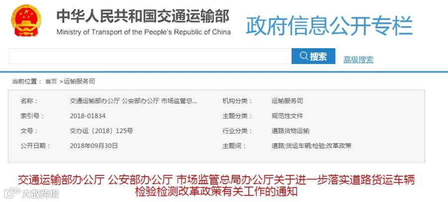9月30日,交通运输部办公厅联合公安部办公厅和市场监管总局办公厅发布《关于进一步落实道路货运车辆检验检测改革政策有关工作的通知》。