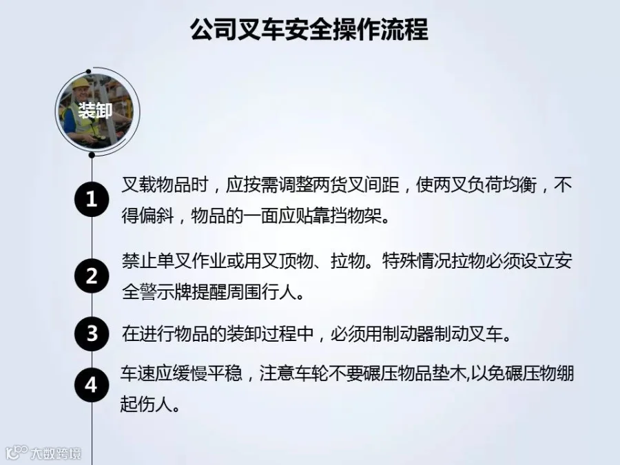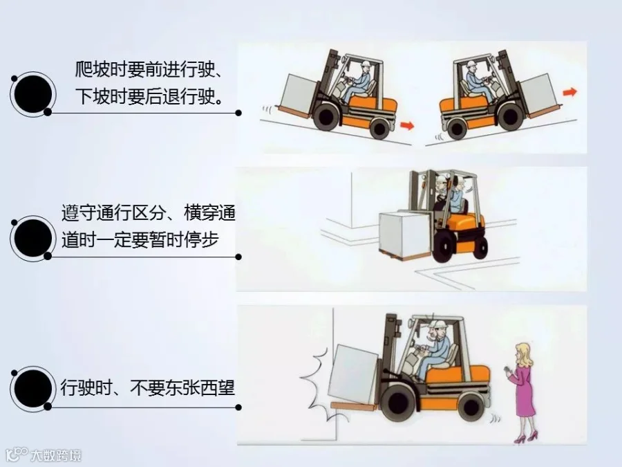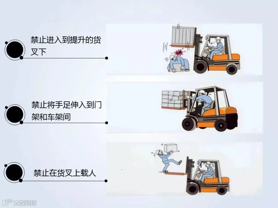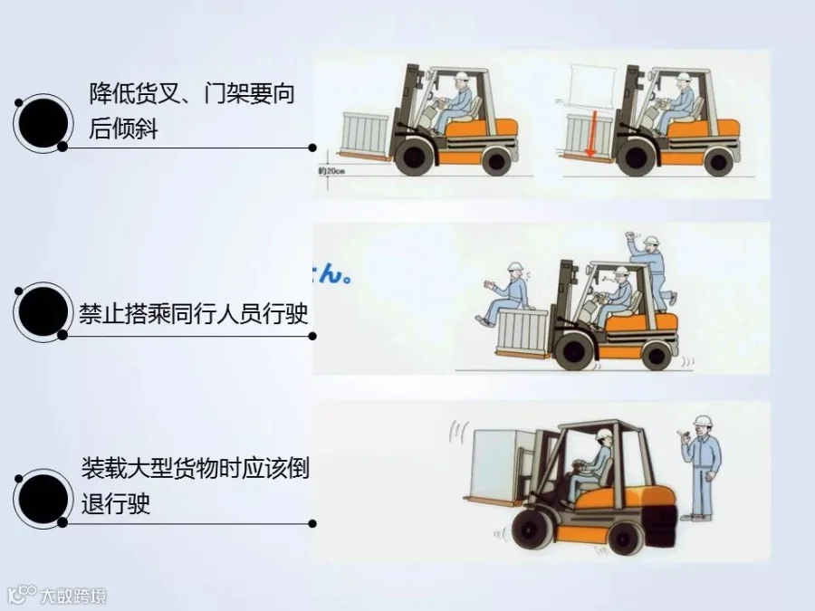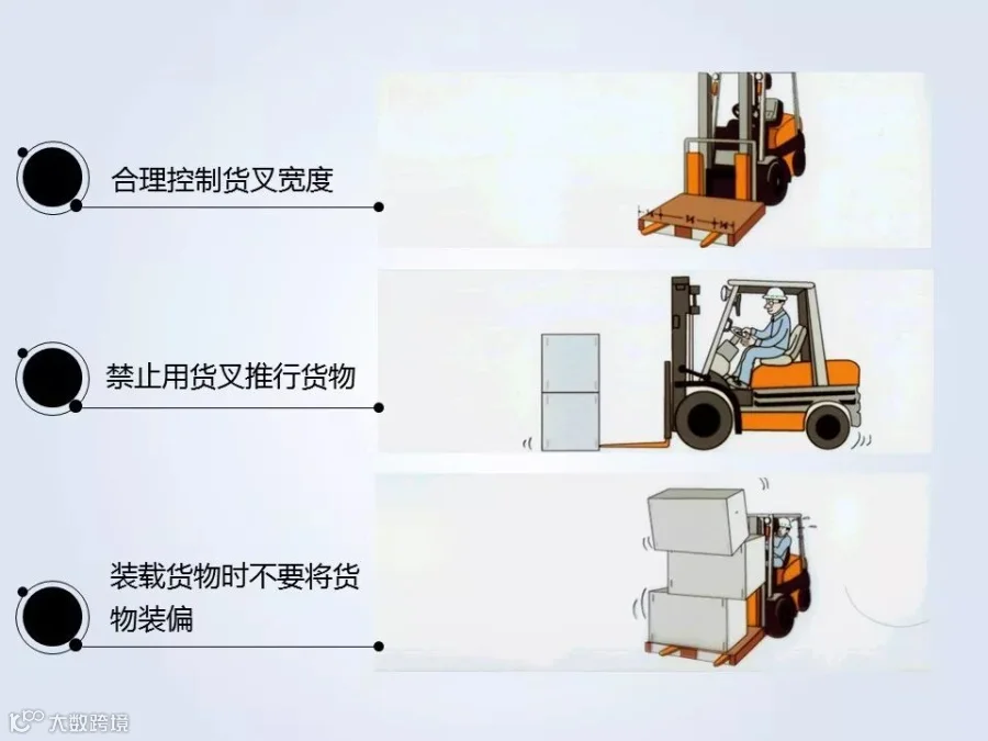 2. 禁止单叉作业或用叉顶物、拉物。特殊情况拉物必须设立安全警示牌提醒周围行人。
