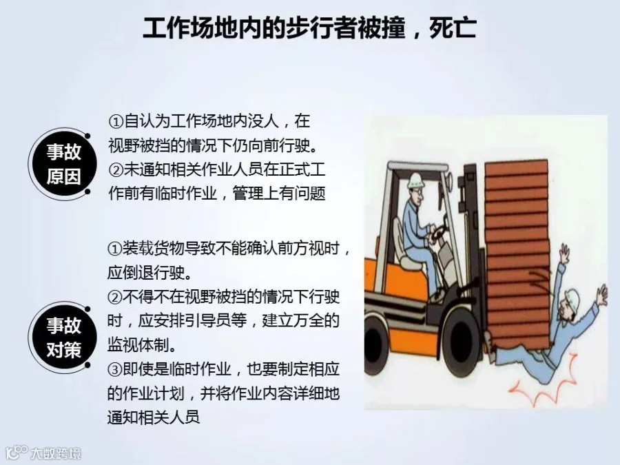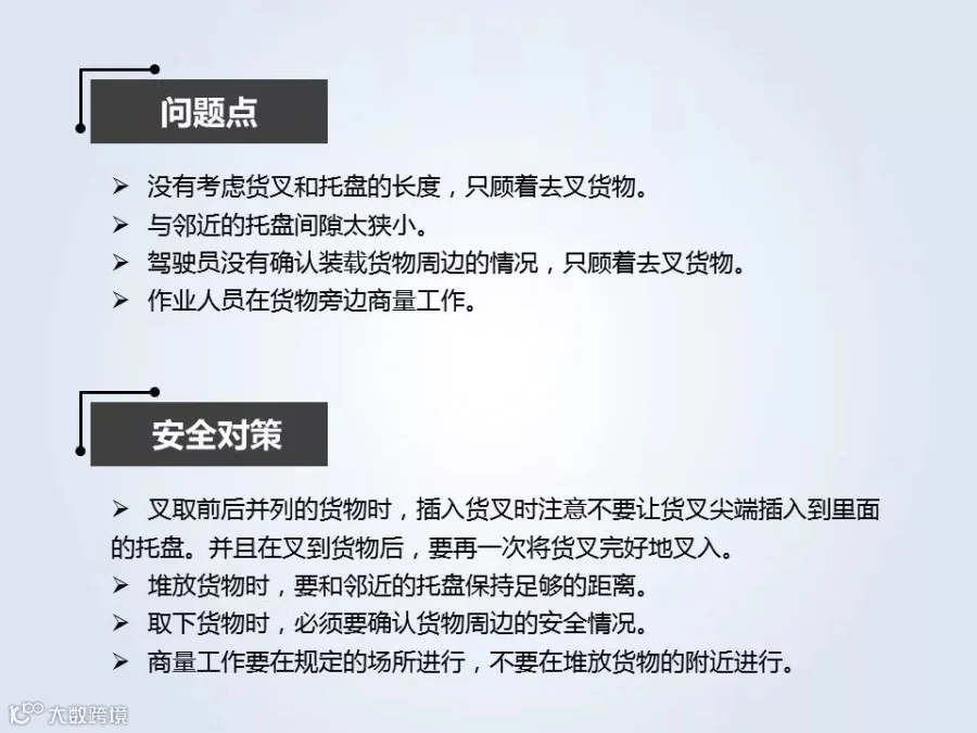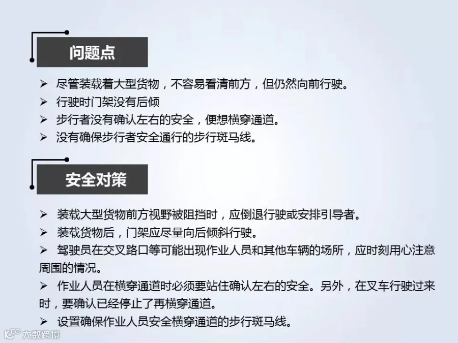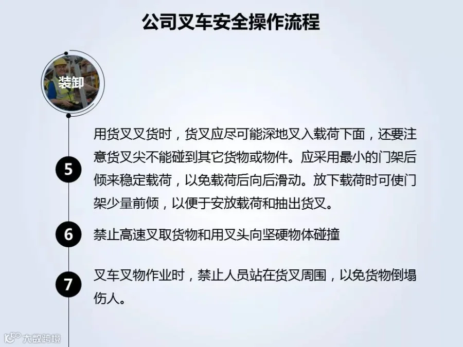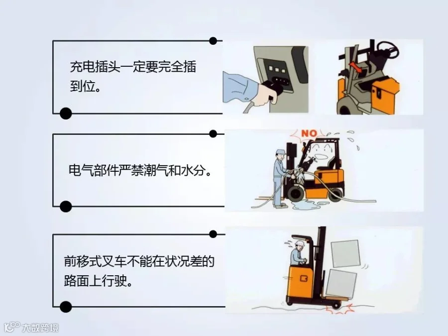 2. 禁止单叉作业或用叉顶物、拉物。特殊情况拉物必须设立安全警示牌提醒周围行人。