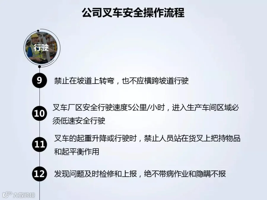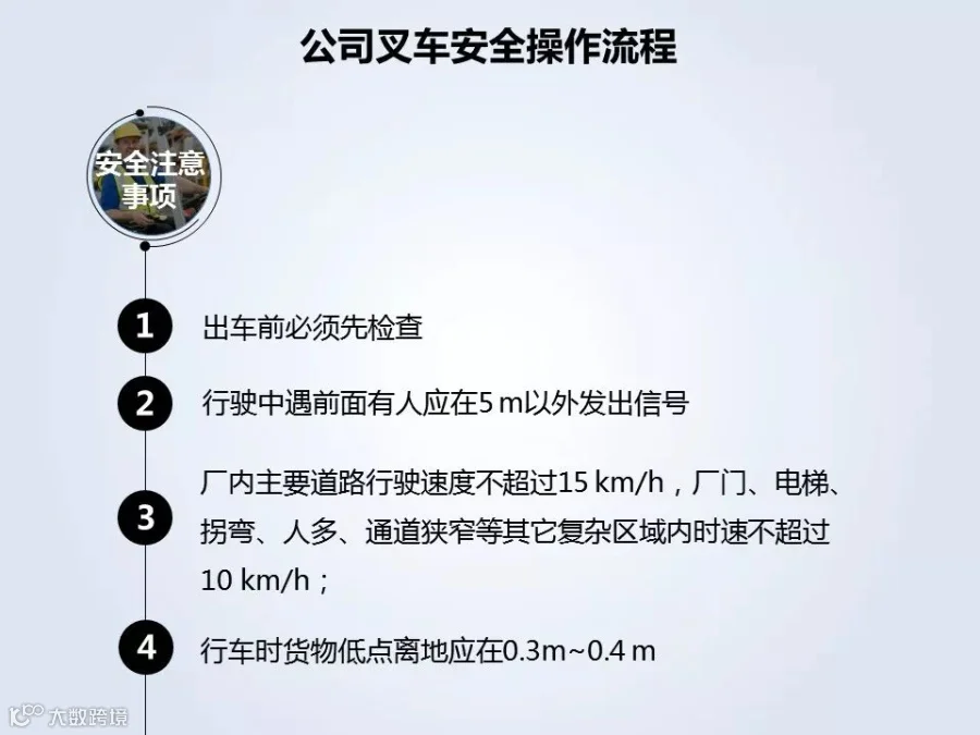 10.叉车厂区安全行驶速度5公里/小时,进入生产车间区域必须低速安全行驶。