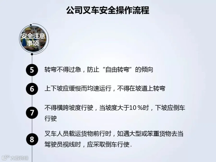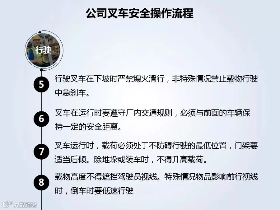 6. 叉车在运行时要遵守厂内交通规则,必须与前面的车辆保持一定的安全距离。