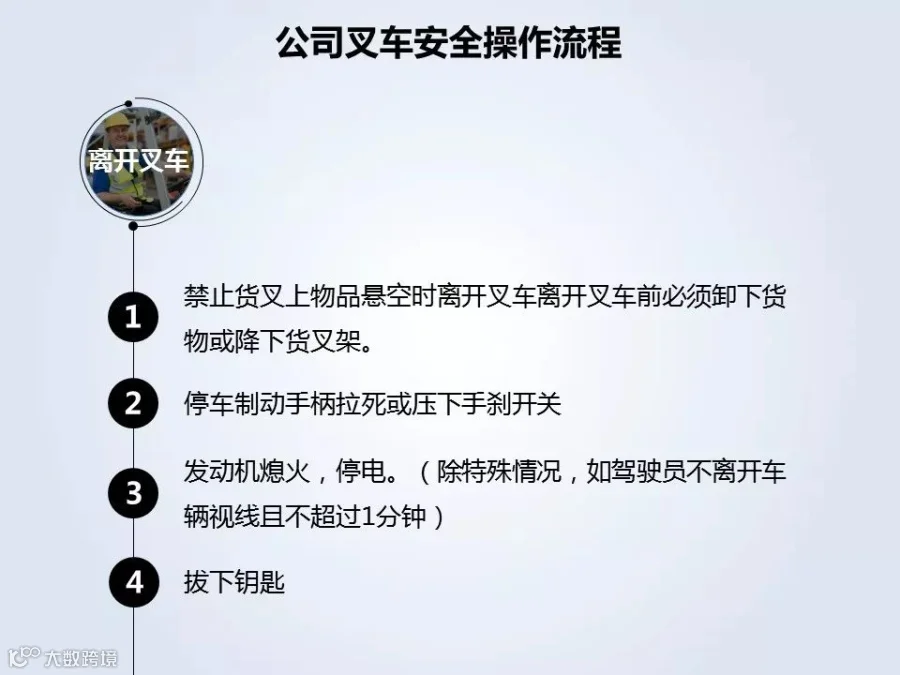 1.禁止货叉上物品悬空时离开叉车离开叉车前必须卸下货物或降下货叉架。