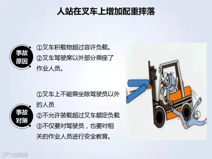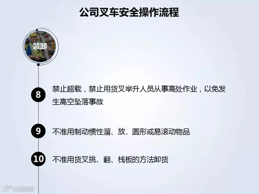 8. 禁止超载,禁止用货叉举升人员从事高处作业,以免发生高空坠落事故。