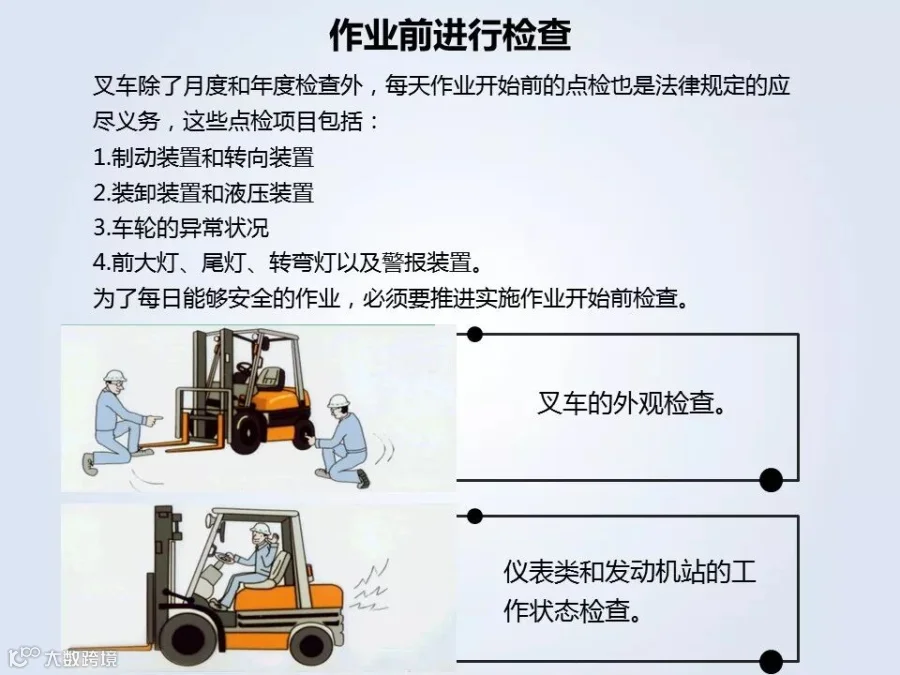 1.叉车作业前后,应检查外观,加注燃料、润滑油和冷却水。